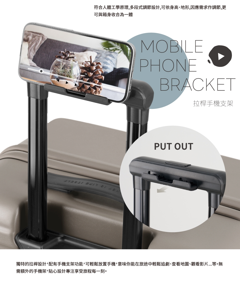 ●配件:TSA海關密碼鎖、便捷式手機支架、 雙向靜音飛機輪